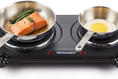Elite Gourmet EDB-302BF# Countertop Double Cast Iron Burner, 1500 Watts Electric Hot Plate, Temperature Controls, Power Indicator Lights, Easy to Clean, Black